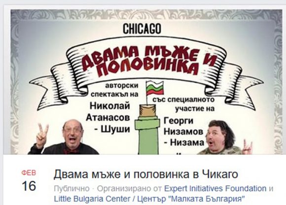 На 16 февруари, неделя, от 19:00 ч. до 21:00 ч., в Little Bulgaria Center в Чикаго ще бъде представен авторския спектакъл на Николай Атанасов – Шуши, с участието на Георги Низамов, „ДВАМА МЪЖЕ И ПОЛОВИНКА“.