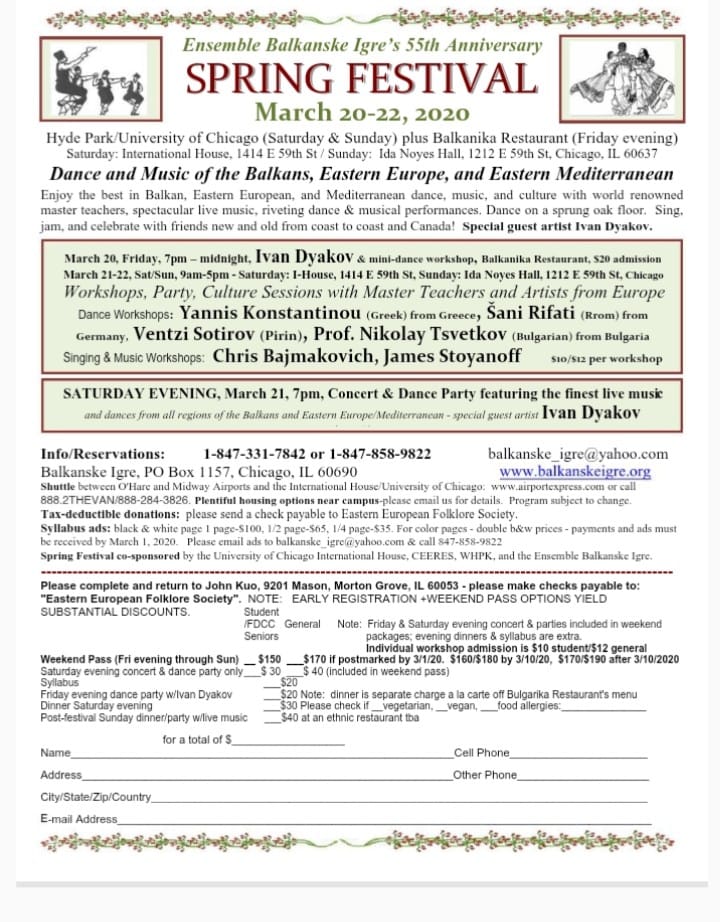 Тазгодишният Пролетен фестивал в Чикаго, на който традиционно се срещат танци и музика от Балканите и Източна Европа, ще се проведе от 20 до 22 март. На Фестивала ще бъде отпразнувана 55-годишнината от основаването на Ансамбъл „Балканске игре“.