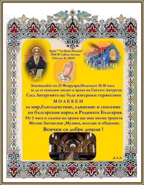 На 23 февруари, неделя, от 10.30 часа, в храма „Св. Иван Рилски Чудотворец“ в Чикаго ще започне Светата литургия. След нея ще бъде извършен тържествен Молебен за мир, благоденствие, единение и спасение на българския народ и Родината. По-късно, от 1 часа следобед, в салона на храма ще има трапеза за Местни заговезни, с музика, веселие и общение.