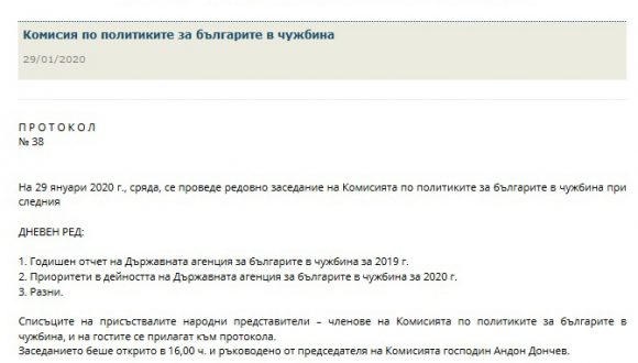 На 29 януари 2020 г., сряда, се проведе редовно заседание на Комисията по политиките за българите в чужбина при следния