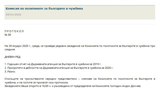 На 29 януари 2020 г. се провежда заседание на Комисията по политиките за българите в чужбина към Народното събрание, но което е представен Годишен отчет на Държавната агенция за българите в чужбина за 2019 г., както и приоритети в дейността на ДАБЧ за 2020 г. На заседанието присъства и.д. председателят на ДАБЧ Димитър Владимиров. Следва стенограмата от това заседание на Комисията, която е публикувана в сайта на НС.