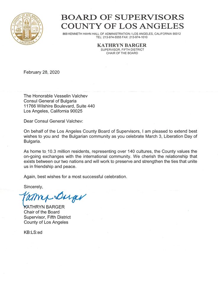 Председателят на Надзорния съвет на окръг Лос Анджелис, г-жа Катрин Баргър, изпрати по повод на 3 март – Деня на Освобождението на България от османско иго, поздравление до българския генерален консул в Лос Анжелис, г-н Веселин Вълчев, и чрез него – до българската общност в града. Затова съобщи на своята ФБ страница генералният консул.