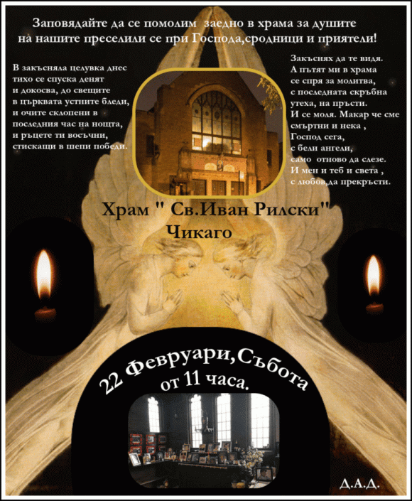 На 22 февруари, събота, Задушница, от 11 часа, в църквата „Св. Иван Рилски Чудотворец“ в Чикаго, ще има църковна служба.