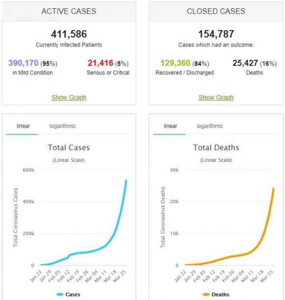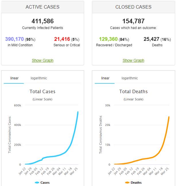 Нека разгледаме случаите до днес, отнесени към броя на жителите на земята и скоростта на разпространение на заразата. Не Ви ли плашат кривите, устремени почти вертикално нагоре? За една година може да има 4 млрд. заразени. При смъртност дори от 1% ще умрат към 40 милиона или толкова, колкото са жертвите от Първата световна война. Дали това са малко хора?