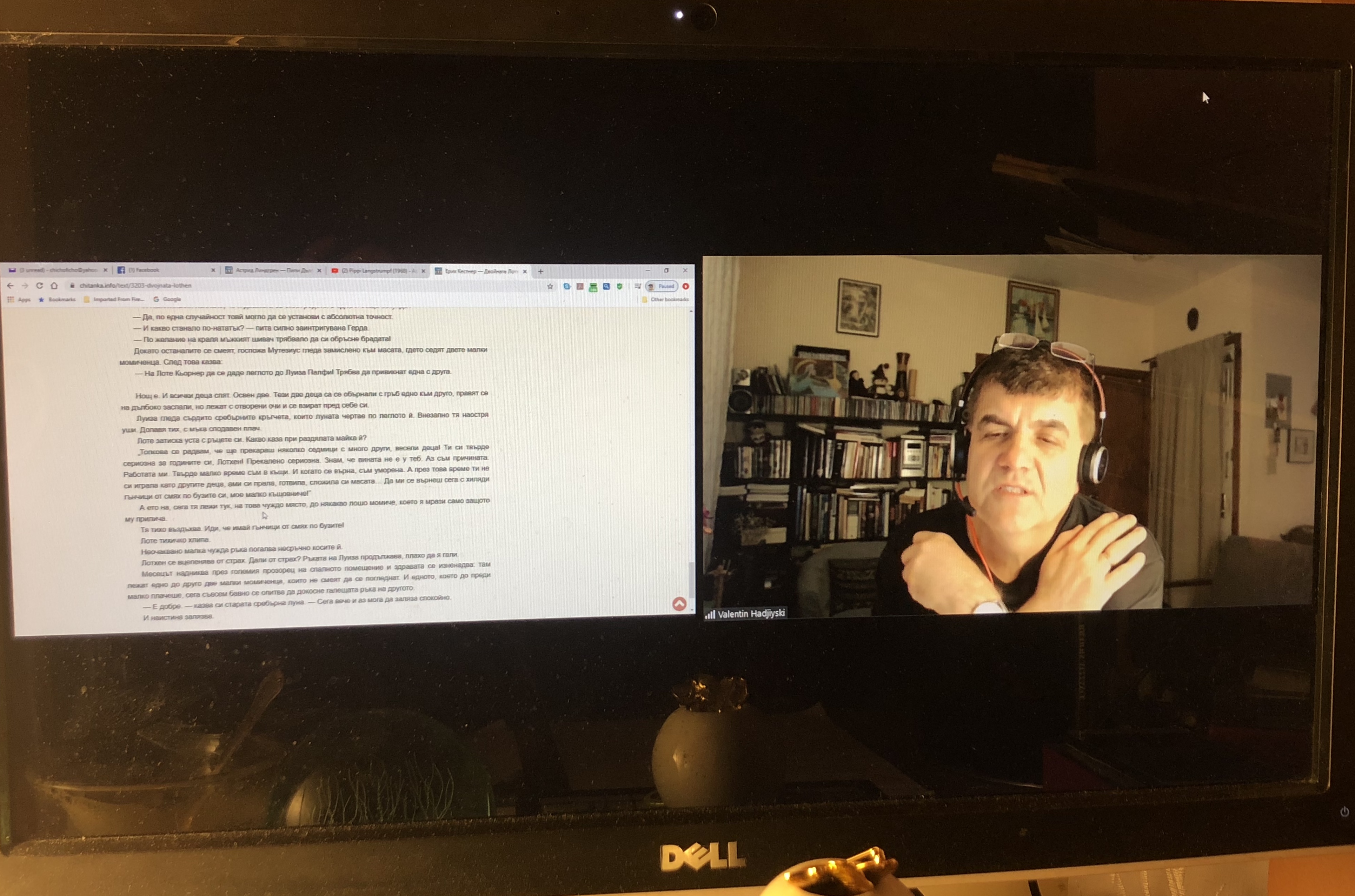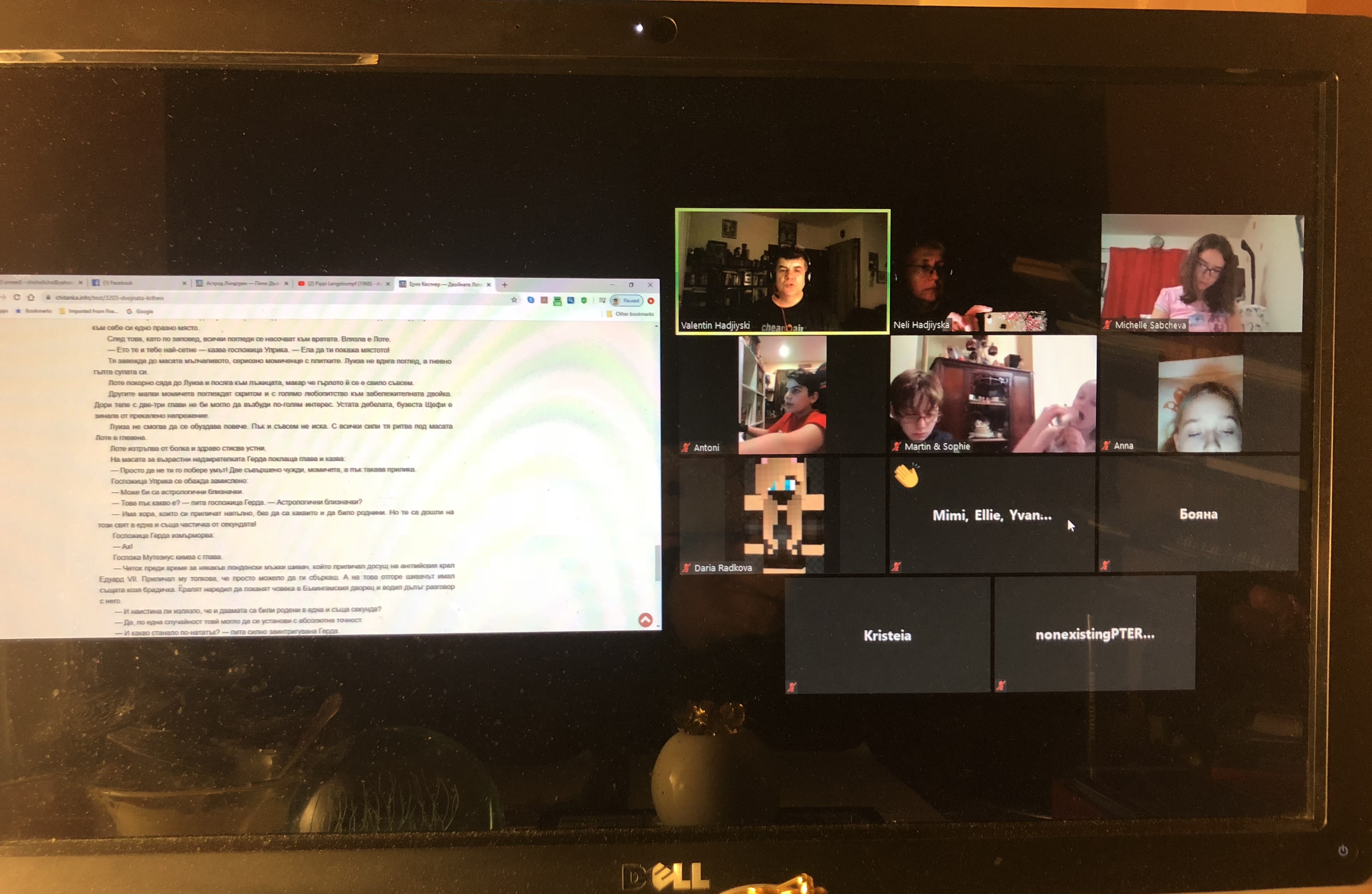 На 25 март беше пилотната ни вечер за две възрастови групи. От 20 часа децата до трети клас слушаха мистър Вал да им чете „Пипи дългото чорапче“ на Астрид Линдгрен за 30 минути, а по-големите, от 4 клас нагоре, започнаха да четат „Двойната Лотхен“ на Ерих Кеснер и слушаха с удоволствие цели 45 минути. На „Пипи“ присъстваха 10 деца, а на „Двойната Лотхен“ – 12 деца и, разбира се, няколко майки. Няколко деца бяха и на двете четения.