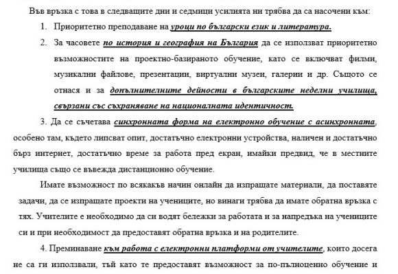 - За часовете по история и география на България да се използват приоритетно възможностите на проектно-базираното обучение, като се включват филми, музикални файлове, презентации, виртуални музеи, галерии и др. Същото се отнася и за допълнителните дейности в българските неделни училища, свързани със съхраняване на националната идентичност.