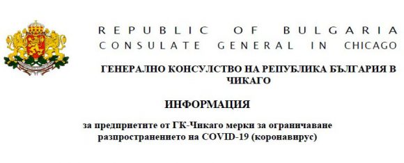 ГК – Чикаго преустановява провеждането и участието в заседания, работни групи и всякакви други прояви. Официалните двустранни срещи в ГК ще бъдат значително намалени. При все, че ГК – Чикаго няма правомощия да ограничава провеждането на мероприятия, организирани от българските обществено-културни, училищни и спортни организации в Чикаго и Средния Запад на САЩ, силно насърчаваме избягването на големи струпвания от хора по повод на събития от подобен характер. Препоръчваме българските обществено-културни, училищни и спортни организации от консулски окръг Чикаго да следят епидемиологичната обстановка, според изявленията на официалните институции – щатските министерства/департаменти по обществено здраве (Departments of Public Health) и училищните райони (School Districts). Следва да се има предвид, че някои публикации в социалните мрежи могат да имат подвеждащ или манипулативен характер, целящ всяване на психоза сред населението.