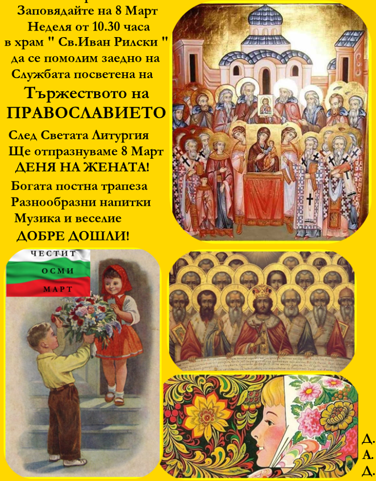 На 8 март, Неделя Православна, от 10.30 часа, ще започне Светата литургия в храма „Св. Иван Рилски Чудотворец“ в Чикаго. След службата ще има тържество по повод Международния ден на жената, с разнообразна постна трапеза, напитки, музика и веселие.