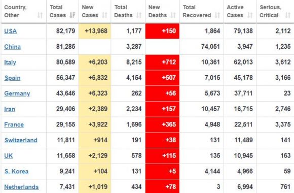 По данни на „Ню Йорк Таймс” и на сайта worldometers.info, най-малко 82 000 души са заразени с коронавирус в САЩ, което е повече, отколкото в Китай, Италия или която и да е друга държава в света.