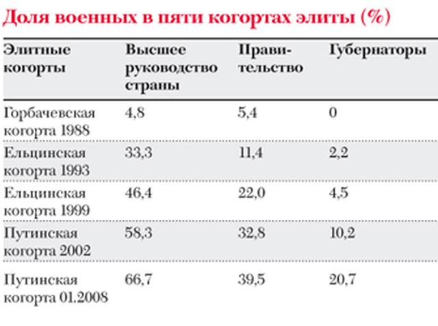 Още през 2008 г. Ольга Крыштановская, в статия под заглавие НОВАЯ РУССКАЯ ЭЛИТА, алармира за създаване на нов елит в Русия (вж. снимката горе – нарастващия брой военни).