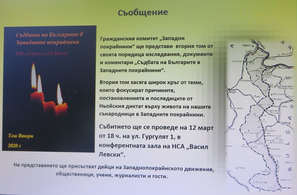 На 12 март т.г., от 18 ч. местно време, Граждански комитет „Западни покрайнини“ ще представи в София, в конферентната зала на НСА „Васил Левски“ (ул. „Гургулят“ 1), втория том от своята поредица изследвания, документи и коментари „СЪДБАТА НА БЪЛГАРИТЕ В ЗАПАДНИТЕ ПОКРАЙНИНИ“.