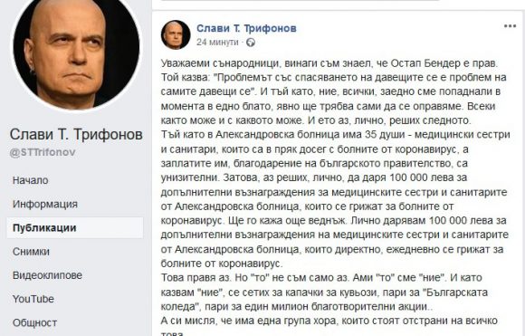 Слави Трифонов написа на стената си във Фейсбук, че ще дари 100 000 лева „за допълнителни възнаграждения на медицинските сестри и санитарите от Александровска болница, които директно, ежедневно се грижат за болните от коронавирус“. Той призова, освен това, „българските депутати, както и министрите от правителството, както и българския президент, да дарят парите от заплатите си в тази криза, за конкретни мерки за справяне със заразата от коронавирус. Както и субсидиите. Българските партии от парламента държат парите си на влог. Сега е време да ги използват за „ползу роду“. Ето цялото съобщение на Трифонов в социалната мрежа: