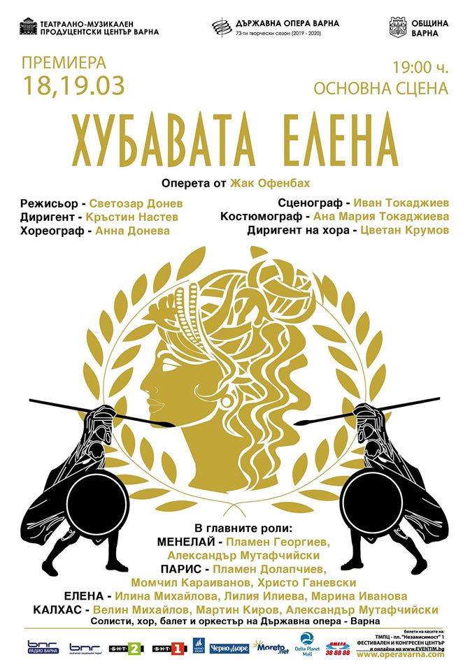 Оперета от Жак Офенбах. Режисьор Светозар Донев. Диригент Кръстин Настев. Хореография Анна Донева. Сценография Иван Токаджиев. Костюми Анна Мария Токаджиева. Диригент на хора Цветан Крумов. В ролите: МЕНЕЛАЙ – Пламен Георгиев, Александър Мутафчийски; ПАРИС – Пламен Долапчиев, Момчил Караиванов, Христо Ганевски; ЕЛЕНА – Илина Михайлова, Лилия Илиева, Марина Иванова; КАЛХАС – Велин Михайлов, Мартин Киров, Александър Мутафчийски. Оркестър, хор и балет на Държавна опера – Варна.
