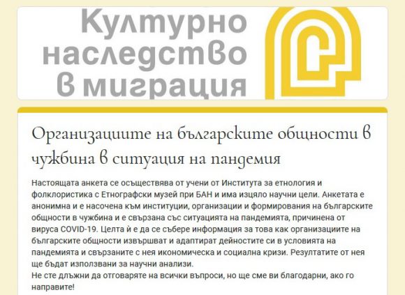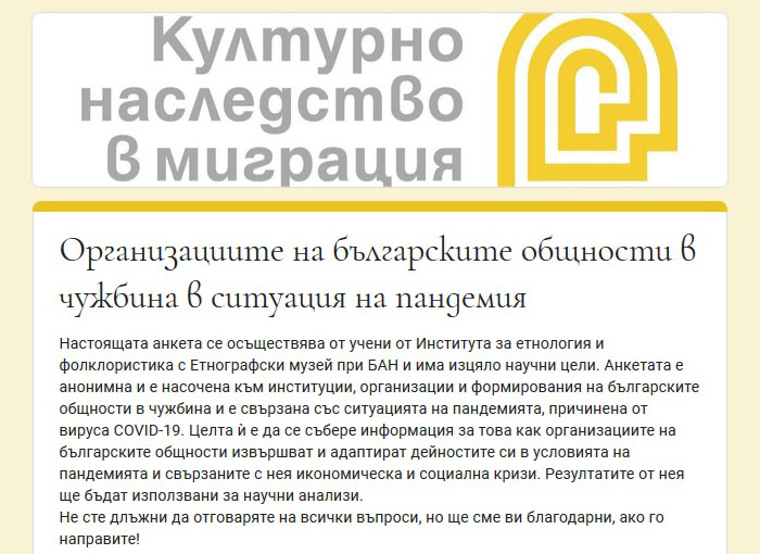 Настоящата анкета се осъществява от учени от Института за етнология и фолклористика с Етнографски музей при БАН и има изцяло научни цели. Анкетата е анонимна и е насочена към институции, организации и формирования на българските общности в чужбина, и е свързана със ситуацията на пандемията, причинена от вируса COVID-19. Целта ѝ е да се събере информация за това как организациите на българските общности извършват и адаптират дейностите си в условията на пандемията, и свързаните с нея икономическа и социална кризи. Резултатите от нея ще бъдат използвани за научни анализи.