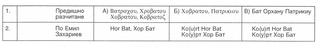 „Гръцките монограми на двата пръстена – печата (прил. 32) биха били също така ОТ РЕШАВАЩО ЗНАЧЕНИЕ, за отъждествяването на хана от Малая Перешчепина и може би дори по-убедителни от доказатествената стойност на археологическите улики, ако можеше да бъдат НЕДВУСМИСЛЕНО РАЗЧЕТЕНИ! Четенето на В. Н. Бенешевич и предложението на В. Финк не дадоха ползотворен резултат. Госпожа А. Банк ми предостави през юли 1983 г. в Ермитажа восъчни отпечатъци от двата пръстена-печати, чиито снимки (прил. 32) изпратих за експертиза и на д-р В. Зайбт от Института по византология към Университета във Виена. След завършване на ръкописа си получих в писмо от 17.11.1983 г. следното становище: “Пръстенът с по-простия монограм е възможно да е византийско производство, докато за другия не бих поддържал същото. По-простия монограм би могло да бъде разчетен теоретично БАТРАХОУ, но изведената отвътре вероятност и условията, при които е открита находката, говорят повече за форми като ХОБРАТОУ, ХРОБАТОУ, ХОБУРТ и т. н.. Следователно, бихме се доближили много до буквени комбинации, доказани във връзка с КОБРАТОС (сравни Моравчик), но само с Х вместо К. Откъм монограма не може да се изведе улика за точния последователен ред на отделните букви в разчитането. Вторият монограм е най-вероятно комбинация от индивидуално име и титла на ранг или длъжност. Ако приемем тъждествеността на собственика на пръстена и следователно същото име, цялостното разчитане на ХРОБАТОУ ПАТРИКИУ би било съвсем възможно. При такова тълкуване своеобразната, НЕ СЪВСЕМ ВИЗАНТИЙСКА БУКВА на отпечатъка, накрая, вляво, трябва да се чете В, а накрая вдясно лигатурата П и К. ДВЕТЕ РАЗЧИТАНИЯ БИХ ИСКАЛ ДА ПРЕДЛОЖА КАТО ВЪЗМОЖНОСТИ. ТРЯБВА ДА СЕ ВЗЕМЕ ПРЕДВИД, ЧЕ ОТ ОНОВА ВРЕМЕ СА ДОШЛИ ДО НАС МНОГО МАЛКО ИМЕНА.“