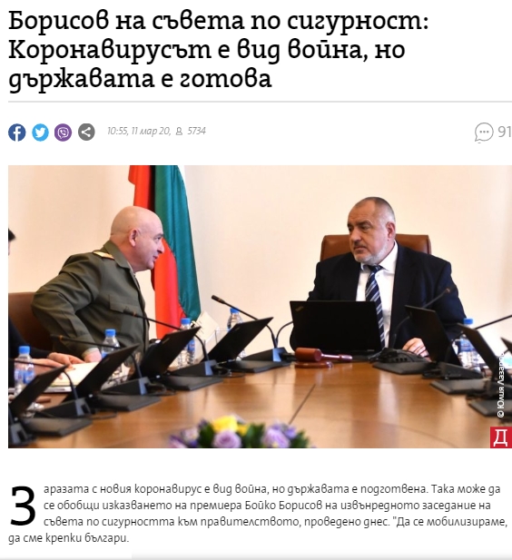 Българското правителство обяви, че сме във война с коронавируса. Призова ни да му вЕрваме, да сме смели и отговорни, и ни поведе в битката (вж. снимка).
