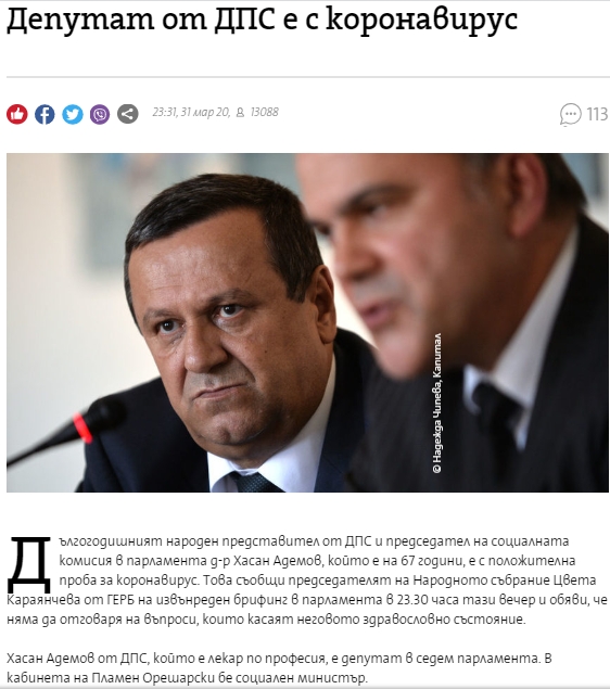 „Имаме народен представител с установен положителен тест за коронавирус. Това е д-р Хасан Адемов от ДПС.“ Това съобщи председателят на парламента Цвета Караянчева на извънреден брифинг вчера.