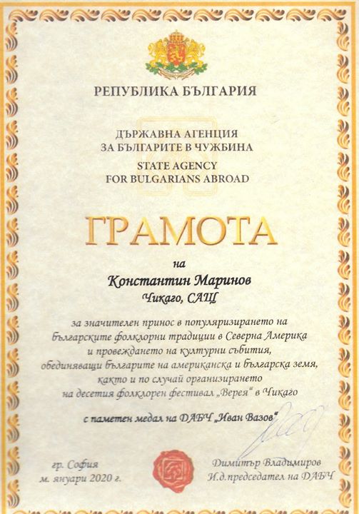 Държавната агенция за българите в чужбина удостои КОНСТАНТИН МАРИНОВ, основател и ръководител на Фолклорен клуб „ВЕРЕЯ“ – Чикаго, с паметен медал „ИВАН ВАЗОВ“.