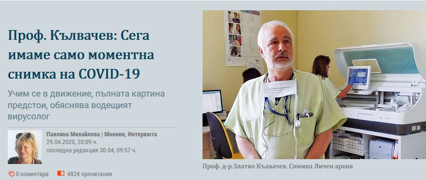 „В хода на пандемията постоянно излизат нови елементи, които се описват за първи път. Странното е, че в немалко от случаите, описани дори в рамките на 24-48 часа, има данни, които си противоречат. Публикува се нещо от една клиника и след малко друга клиника, която може и да не е на другия край на света, твърди точно обратното. Това се наблюдава и по отношение на патогенезата (механизма на действие на инфекциозния агент), и по отношение на лечението. Едни съобщават за една комбинация от медикаменти, на следващия ден други пишат, че точно тази комбинация не само че не е успешна, а влошава положението на болния.“ – из интервю на Павлина Михайлова с проф. д-р Златко Кълвачев, публикувано в Сlubz.bg.