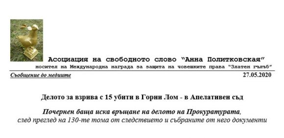 На 28.05.2020 г., от 09:30 ч., Апелативен съд – София по дело 1213/2019, Първи състав, в Съдебната палата на бул. “Витоша” 2, след двукратното отлагане по процедурни въпроси, ще гледа жалбите срещу оневиняването от Окръжен съд – Видин на четиримата обвиняеми, привлечени от Прокуратурата като единствени виновници за трагедията с взрива в Горни Лом на 01.10.2010 г., при който загинаха 15 души.