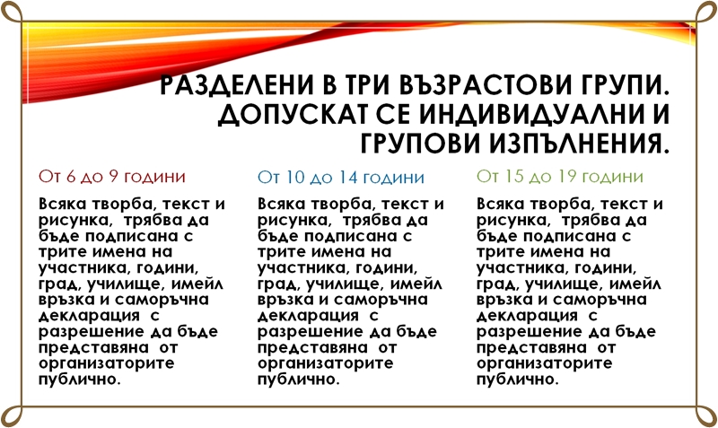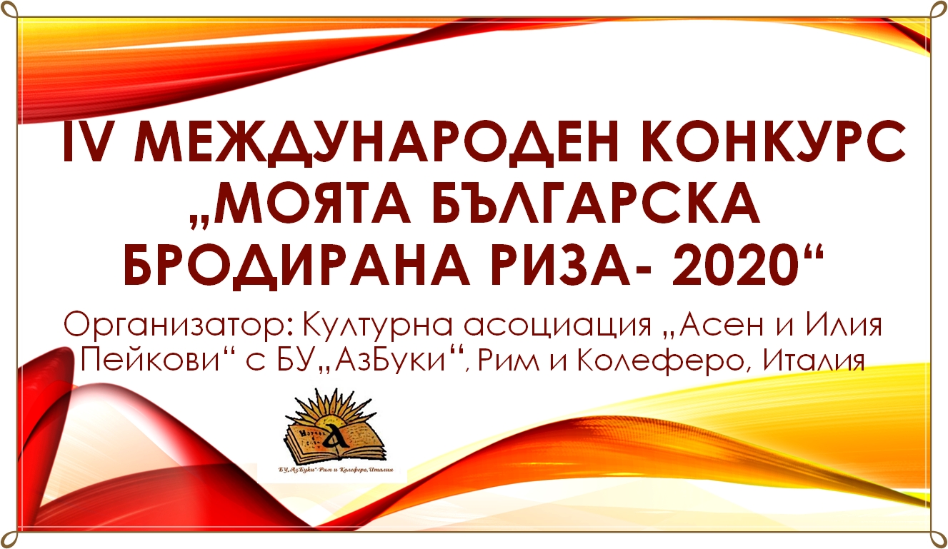Покана за участие в IV Международен конкурс „МОЯТА БЪЛГАРСКА БРОДИРАНА РИЗА – 2020“, организиран от Българско училище „АзБуки“ в Рим и Колеферо, Италия, за четвърта поредна година. Конкурсът е за рисунка и художествен текст, свързан с българската бродирана шевица.