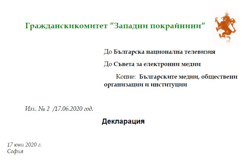 Граждански комитет „Западнни покрайнини” за пореден път изразява своето възмущение от недопустимия модел на управление и манипулиране на журналистиката в националната медия. БНТ не е частно-лобистка структура за пропагандно влияние в нашето общество и всяка подобна провокация ще среща остър социален отпор. Несъобразяването с него, води до все по-задълбочаващ се колапс на тази институция в нашето съвремие.