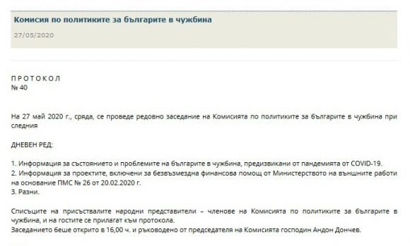 На 27 май 2020 г. се провежда заседание на Комисията по политиките за българите в чужбина към Народното събрание, при следния дневен ред: „1. Информация за състоянието и проблемите на българите в чужбина, предизвикани от пандемията от COVID-19; 2. Информация за проектите, включени за безвъзмездна финансова помощ от Министерството на външните работи на основание ПМС № 26 от 20.02.2020 г.; 3. Разни“. На заседанието присъстват зам.-министърът на външните работи Петко Дойков, и.д. председателят на ДАБЧ Димитър Владимиров, Милена Димитрова от кабинета на вицепрезидента Илияна Йотова.