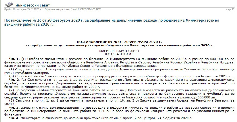 Чл. 1, ал. 1 и 2, от Постановлението гласи: „(1) Одобрява допълнителни разходи по бюджета на Министерството на външните работи за 2020 г. в размер до 500 000 лв. за финансиране на проекти на български общности в Република Албания, Република Сърбия, Република Косово, Украйна и Република Молдова, както и на проекти на граждани на Република Северна Македония с българско самосъзнание.(2) Средствата по ал. 1 се предоставят за проекти по утвърдена от Министерския съвет програма съгласно Закона за българите, живеещи извън Република България.“