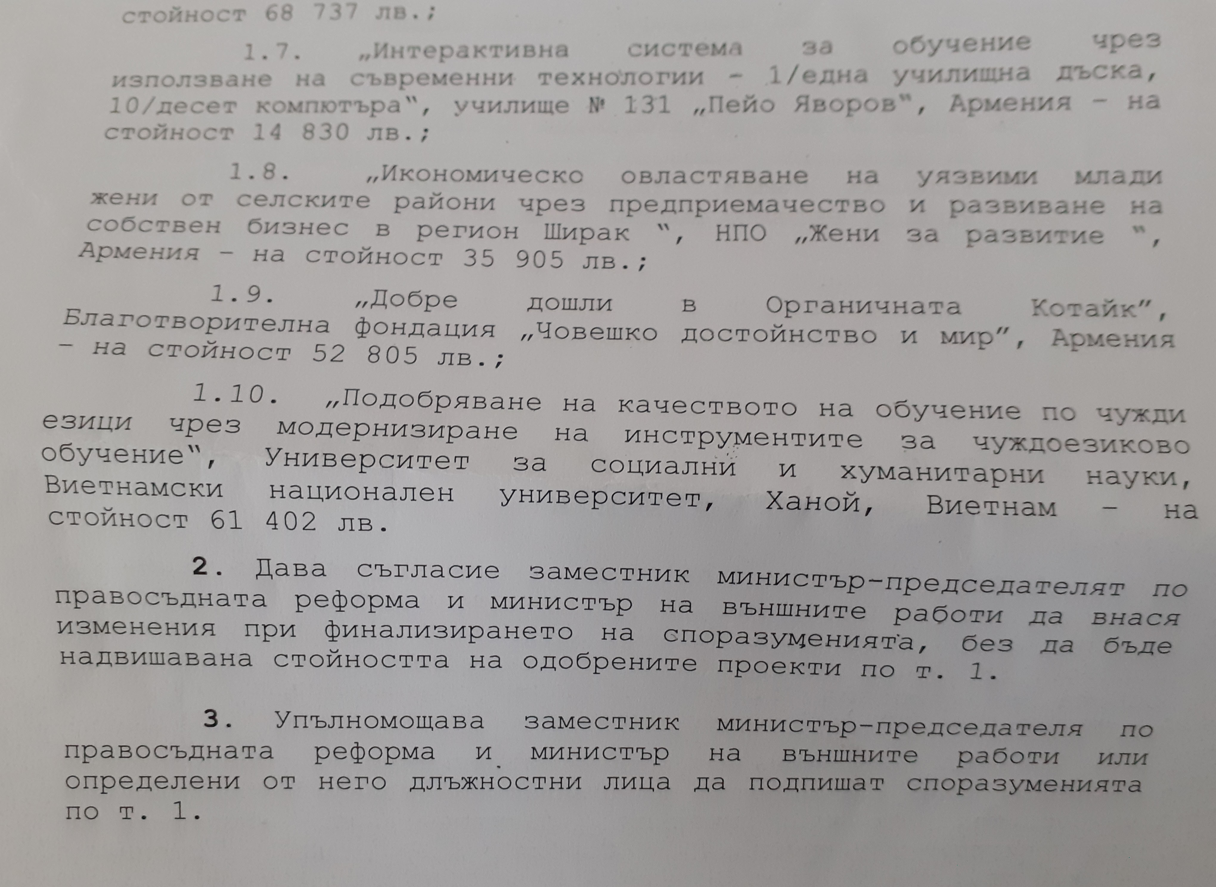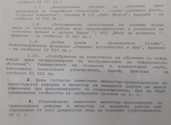 ПРЕДС. АНДОН ДОНЧЕВ: Но аз държа пред мен Решение № 119 от 21 февруари 2020 г. Това е на Министерския съвет, в което вече е взето решение кои точно организации да бъдат финансирани и се дава съгласие да бъдат сключени споразумения за предоставяне на безвъзмездна помощ за изпълнение на проекти в Република Сърбия, Република Северна Македония, Косово, Украйна, Република Молдова, Армения и Виетнам.