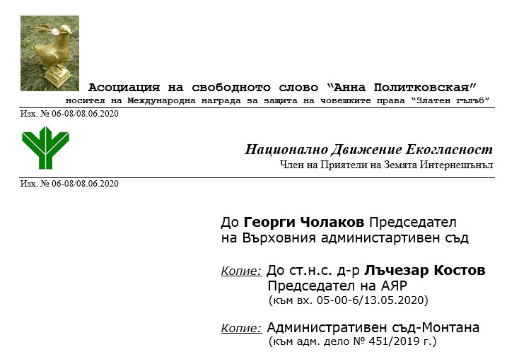 С мое писмо вх. № 05-00-6/13.05.2020 г. по описа на Агенцията за ядрено регулиране (АЯР), уведомих Председателя на АЯР, г-н Лъчезар Костов, за Определение № 5569 от 12.05.2020 г. по адм. дело № 1169/2020 по описа на ВАС, което остави в сила Разпореждане № 16638/06.12.2019 г., постановено по адм. дело № 13867 по описа за 2019 г. на ВАС, Пето отделение, при което Решение № 491/14.10.2019 г. на Административен съд – Монтана по адм. дело № 451/2019 г. е окончателно към датата на постановяването му – 14.10.2019 г. Оставям без коментар обжалванията на АЯР пред две висшестоящи инстанции на съда относно съдебно решение по Закона за достъп до обществена информация, когато е известно, че от 01.01.2019 г. производството по ЗДОИ е едноинстанционно и в случая има очевАдна злоупотреба с право от Председателя на АЯР, за което е бил предварително уведомен от Главния юрисконсулт на АЯР, г-жа Илияна Райчева, след моята молба по телефона веднага след постановяване на решението по адм. д. № 451/2019 г. на АС – Монтана на 14.10.2019 г.