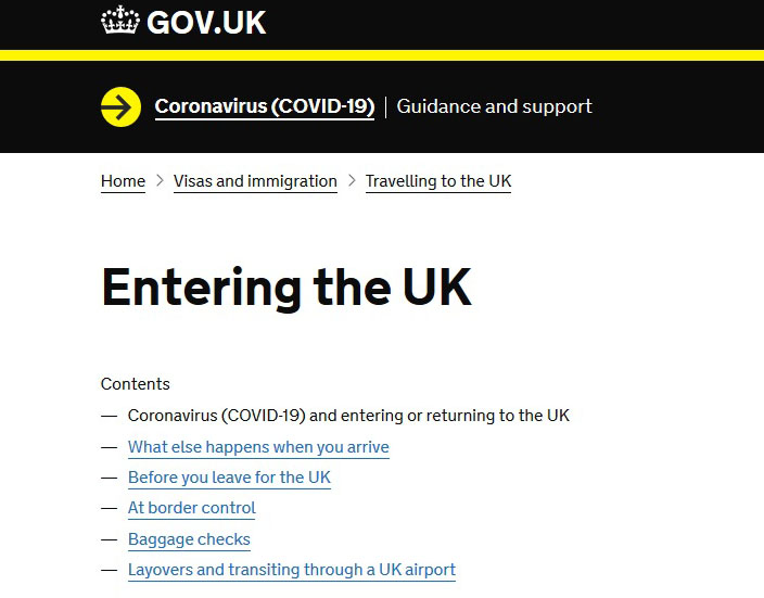 Британските власти са публикували и препоръки за спазването на задължителната 14-дневна карантина при пристигане в страната. Пристигащите трябва директно да се отправят към мястото, на което ще прекарат карантината. Придвижването може да става с личен транспорт, включително и с превозни средства на близки или приятели. Препоръчва се използването на обществен транспорт да става само при крайна необходимост. При използване на обществен транспорт, пътниците трябва да бъдат с покрити нос и уста, и да спазват дистанция от 2 метра.