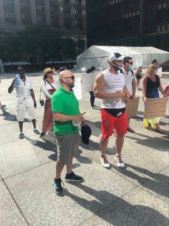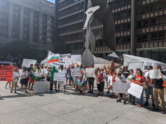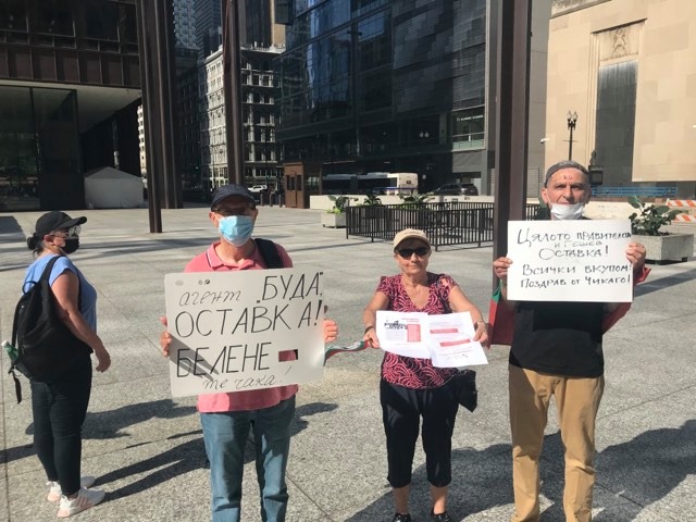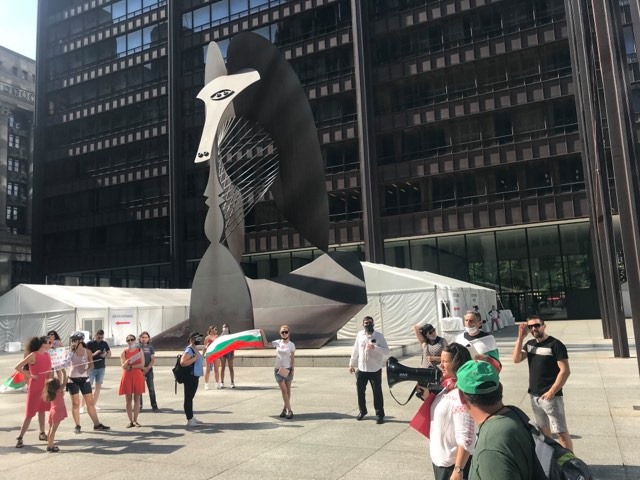 На площада пред кметството в Чикаго, на „Дейли Плаза“ вчера, въпреки ужасната жега, се събраха около 70 българи, които искаха да подкрепят протестите срешу корупцията и беззаконието в Родината.