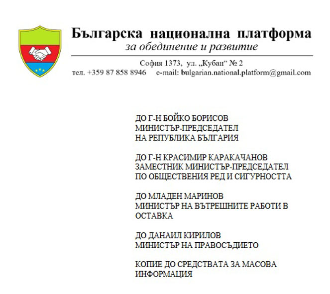 Във връзка със случая Ридван Караходжа, за който нашето издание вече писа (вж. тук), Българска национална платформа за обединение и развитие изпрати днес писмо до премиера Борисов, вицепремиера Каракачанов, вътрешния министър в оставка Маринов и правосъдния министър Кирилов. (Писмото в оригинал: До Бойко Борисов за Ридван Караходжа) В писмото, което е изпратено и до медиите, се казва:
