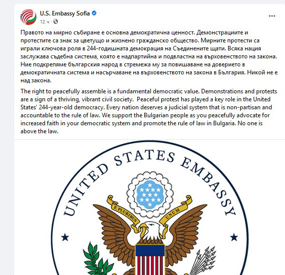 „Правото на мирно събиране е основна демократична ценност. Демонстрациите и протестите са знак за цветущо и жизнено гражданско общество. Мирните протести са играли ключова роля в 244-годишната демокрация на Съединените щати. Всяка нация заслужава съдебна система, която е надпартийна и подвластна на върховенството на закона. Ние подкрепяме българския народ в стремежа му за повишаване на доверието в демократичната система и насърчаване на върховенството на закона в България. Никой не е над закона.“