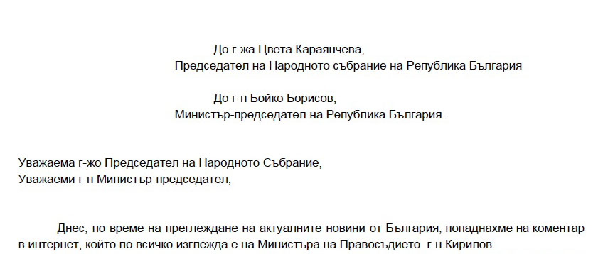 Българи в чужбина се обърнаха с писмо до председателя на Народното събрание Цвета Караянчева и до министър-председателя Бойко Борисов, с искане за оставка на министъра на правосъдието Данаил Кирилов. В писмото се казва: