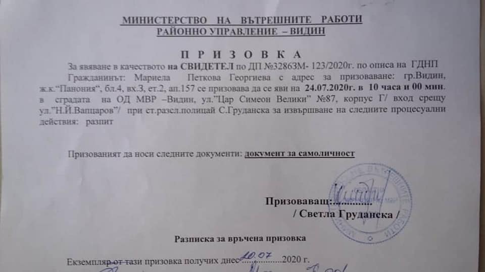 Мариела Георгиева, съпруга на председателя на Гражданско движение „БОЕЦ“ Георги Георгиев, е получила призовка от МВР – Видин, във връзка с обвинение, повдигнато към съпруга й. Семейство Георгиеви живее във Видин, но Георги в момента е в София и участва активно в протестите, с искания за оставка на правителството и на главния прокурор. Мариела има тежко заболяване, неотдавна й бе направена и трансплантация, донор за която бе съпругът й. Според г-н Георгиев, Мариела се е прибрала преди няколко дни във Видин от Александровска болница в София, където е била, за да не бъде използвана като заложник срещу него и ГД „БОЕЦ“. Но и там не е била оставена на мира.