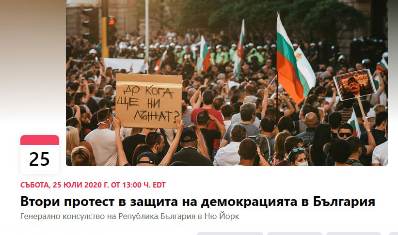 Тази събота, 25 юли, ще има отново протест в Ню Йорк, организиран от сънародници в защита на демокрацията в България. Той ще започне от 13:00 ч. пред Генералното консулство на Р. България в Ню Йорк.