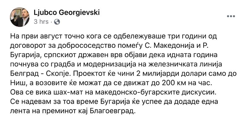 „На първи август, точно кога се одбележуваше три години од договорот за добрососедство помегю С. Македония и Р. Бугария, сръпскиот държавен връв обяви дека идната година почнува со градба и модернизация на железничката линия Белград – Скопйе. Проектот ке чини 2 милиярди долари само до Ниш, а возовите (локомотивите, б.а.) ке можат да се движат до 200 км на час. Ова се вика шах-мат на македонско-бугарските дискусии. Се надевам за тоа време Бугария ке успее да додаде една лента на преминот кай Благоевград“.