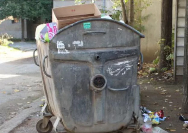 Една жена рови в контейнера за смет. Възрастна, много опърпана, симпатична.