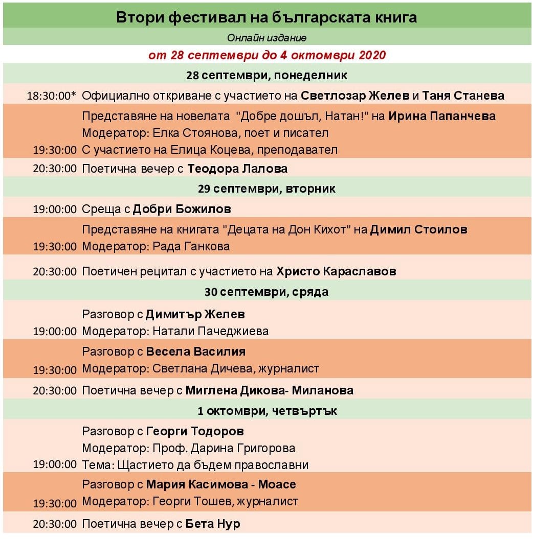 Програмата на Фестивала предвижда дискусии на живо с читателите, литературни четения и интервюта.