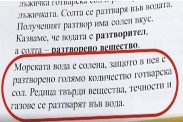 „Морската вода е солена, защото в нея е разтворено голямо количество готварска сол. Във водата се разтварят редица твърди вещества, течности и газове.” – Това пише в учебника