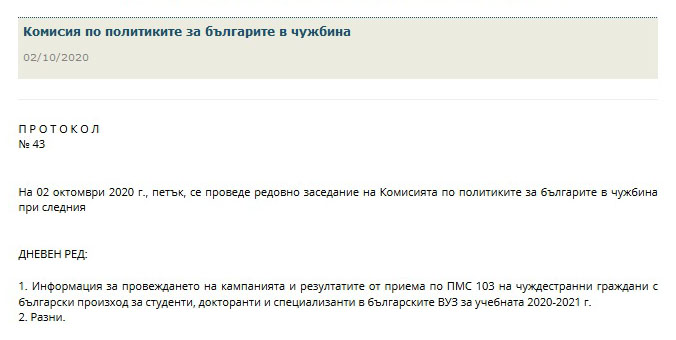 На 2.10.2020 г. се проведе заседание на Комисията по политиките за българите в чужбина към Народното събрание, при следния дневен ред: „1. Информация за провеждането на кампанията и резултатите от приема по ПМС 103 на чуждестранни граждани с български произход за студенти, докторанти и специализанти в българските ВУЗ за учебната 2020-2021 г.; 2. Разни“. На заседанието присъствата представители на Министерството на образованието и науката, ДАБЧ, кабинета на вицепрезидента Йотова, както и представители на Управителния съвет на АБУЧ (вж. тук).