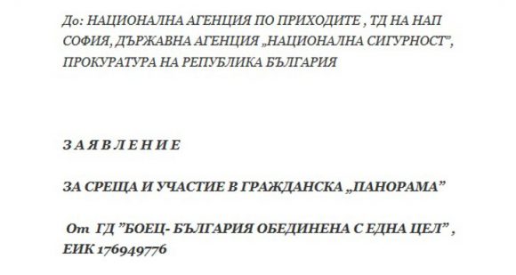 Гражданско движение „БОЕЦ“ е изпратило официално заяление до ДАНС, НАП и Прокуратурата, с което изразява желанието си техни представители да дойдат и участват в т.нар. Гражданска „Панорама“ в петък, 23 октомври, от 18.30 ч., пред БНТ, и да отговорят на въпросите за институционалния натиск над ТВ „Евроком“.