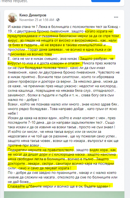 🙏А на Кико Димитров желаем бързо възстановяване – неговите антитела са жизненонеобходими за оздравяване на обществото и могат да спасят хиляди; и здраве – за да може да продължи да е патриот, но с правилни послания и щастливо семейство. Благодарим му за достойнството и смелостта, в постинга му от 25 ноември .