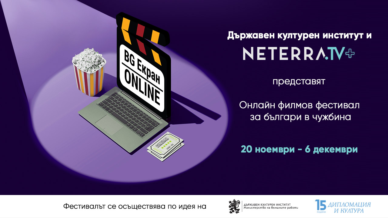 Над 20 родни филмови продукции ще бъдат достъпни за гледане извън територията на България, по повод 15 години от създаването на Държавния културен институт към министъра на външните работи. Инициативата ще продължи от 20 ноември до 6 декември. Виртуалният филмовият фестивал „БГ ЕКРАН ОНЛАЙН“ ще представи разнообразна селекция от съвременни пълнометражни, късометражни, документални и анимационни филми.