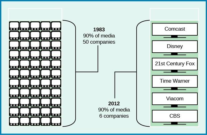 За разлика от социалистическа Народна Република България, в която контрол над медиите са имали Партията и няколко отдела на ДС, към 1985 година в САЩ 90% от медийното съдържание се е контролирало от над 50 различни компании.
