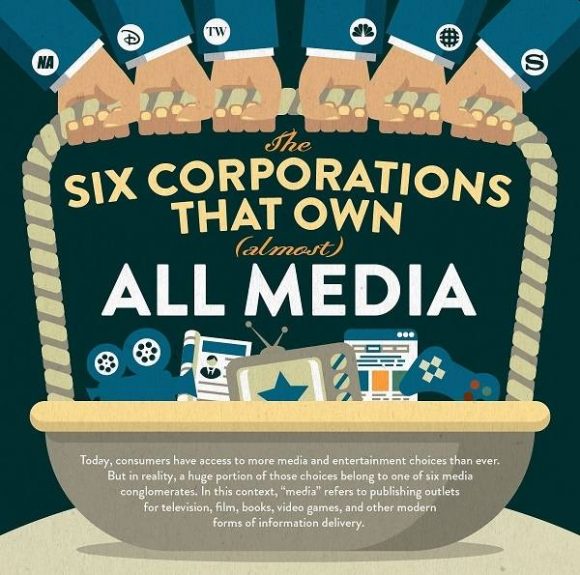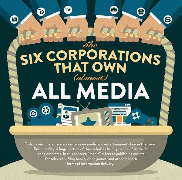 Тази графика, създадена от Д. Джейсън, която е публикувана във Frugal Dad през 2011 г., ни показва, че почти всички медии в Америка идват само от шест големи компании (пълната инфографика може да намерите ТУК). Към днешна дата те щяха да са още по-малко на брой, ако към тях не се присъедини и Гугъл.