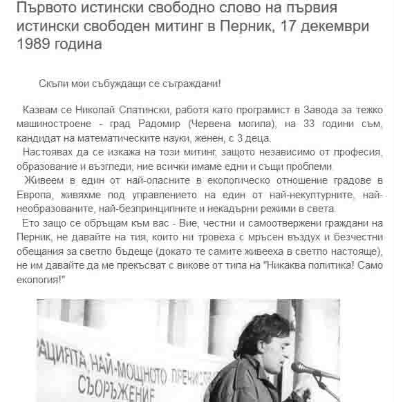 И понеже е 10 ноември, ще кача тук своето слово на първия свободен митинг в Перник. Това беше първото свободно слово в Перник. И аз продължавам да съм щастлив и горд, че то бе моето слово. Днес се подписвам под всяка дума в това слово. Вярвам, че въпреки редица лутания и грешки, аз в главното останах верен на това свое слово. Но така мисля аз и никого не принуждавам да мисли като мен.