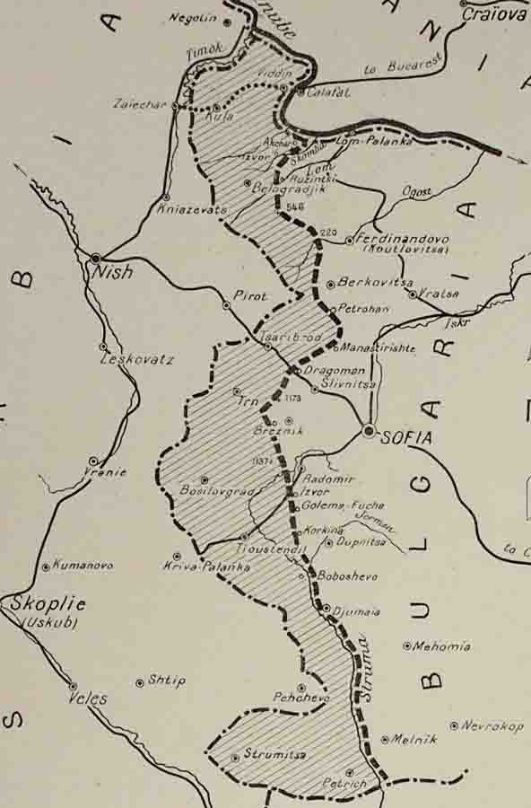 Днешната западна граница на България, направена върху абстрактна географска карта на парижките дипломатически маси, е всъщност „благоволението“ на съдниците от Парижката конференция, защото истинските претенции на Сръбско-Хърватско-Словенската държава са по линията Лом – Петрохански проход – Перник и десния бряг на р. Струма. Само протестът на Американската и Италианската делегации е спасил от „братската свобода“ на Сръбското кралство голяма част от Западна България. „Благоволението“ довежда до „прокарване“ на границата между България и Кралството на Сърби, Хървати и Словенци, през дворове, през улици и градини, през църкви – през 25 населени места, без да се взимат под внимание всякакви хуманни основания. Сръбските гранични войски поставят телени заграждения, военни постове, наблюдателни кули, които превръщат тези населени места в своеобразни концлагери. С течението на времето, това довежда до естественото им замиране и изгнание на населението, вследствие на невъзможността за нормално съществуване.