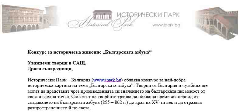 Исторически Парк – България (www.ipark.bg) обявява конкурс за най-добра историческа картина на тема „Българската азбука“. Творци от България и чужбина ще могат да представят чрез произведенията си значението на българската писменост от своята гледна точка. Сюжетът на творбите трябва да обхваща времевия период от създаването на българската азбука (855 – 862 г.) до края на XV-ти век и да отразява разпространението й по света.